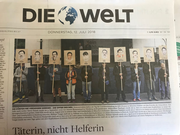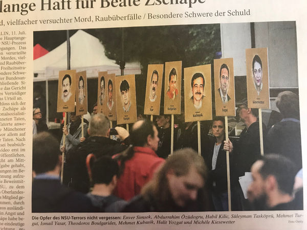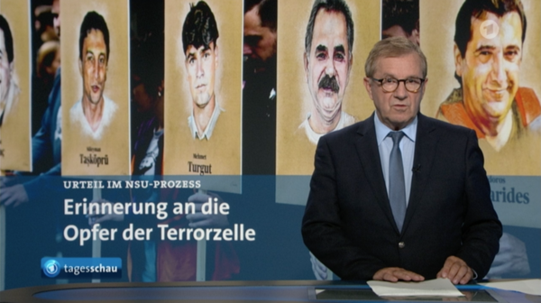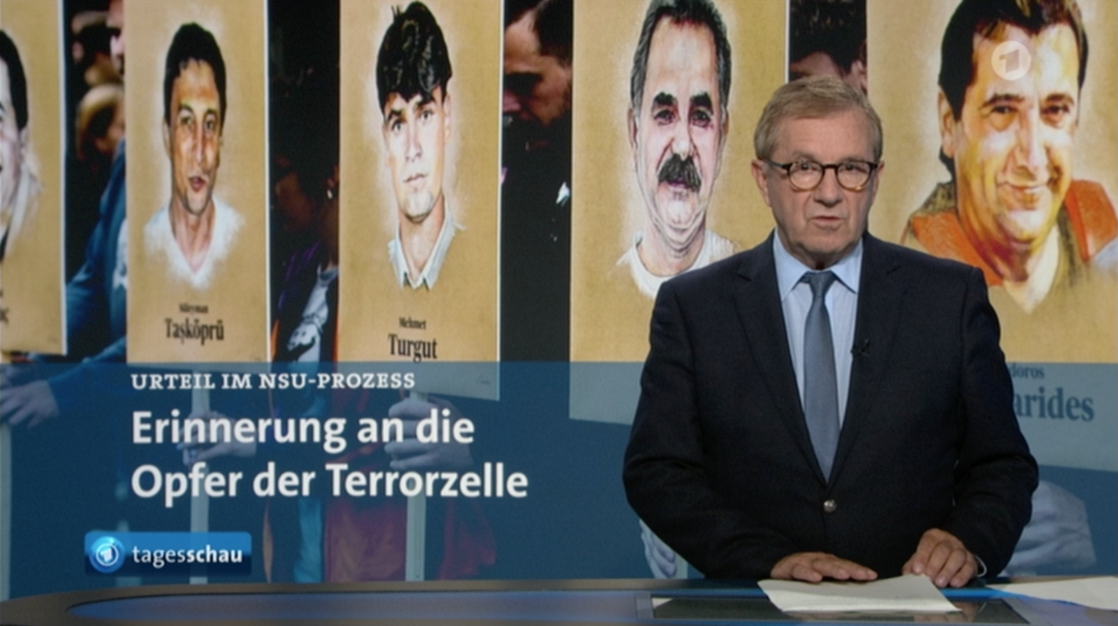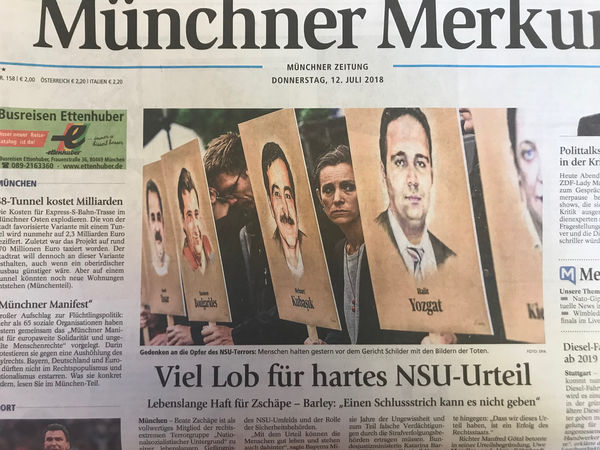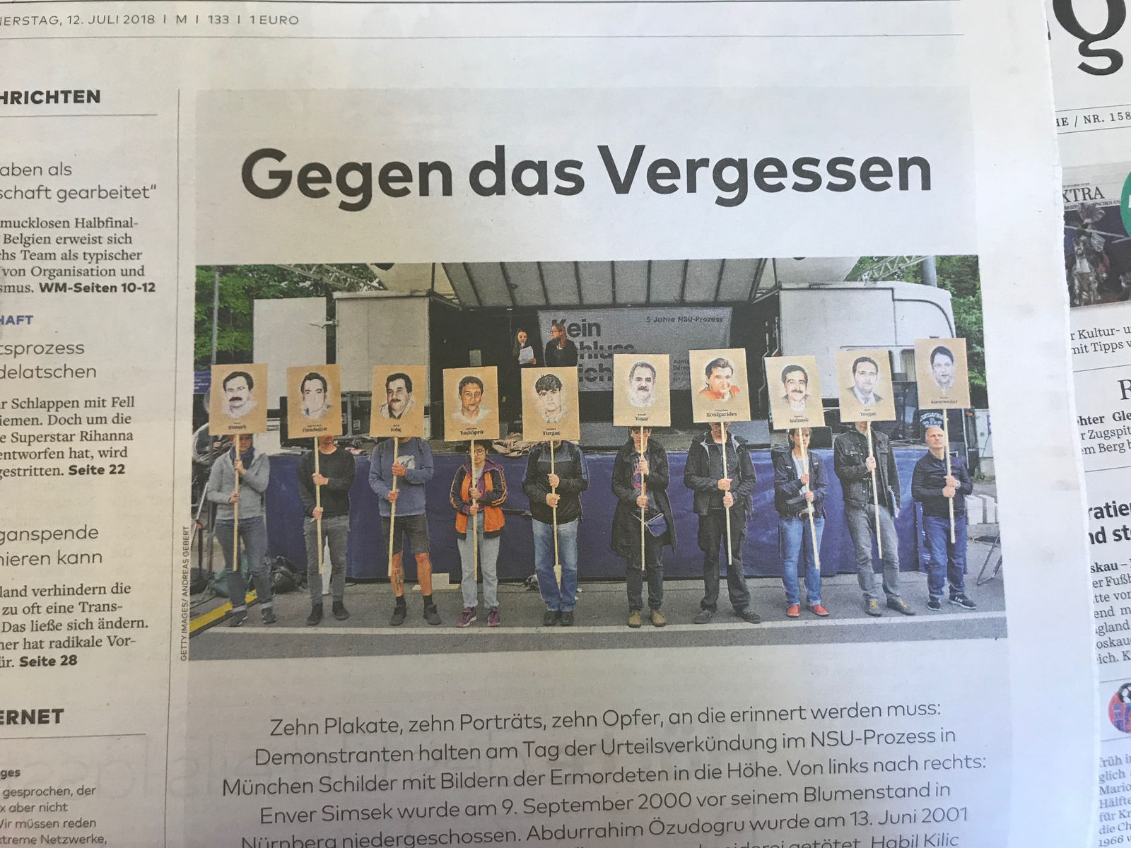 The media gratefully seized the opportunity to use the new portraits of the NSU murder victims, which were unveiled at the announcement of the verdict in the main trial, to direct the focus of reporting on the victims and their survivors instead of once again putting the perpetrators in the foreground. Signs of the victims' portraits were seen in almost all major daily newspapers as well as in television coverage, including the Tagesschau.
